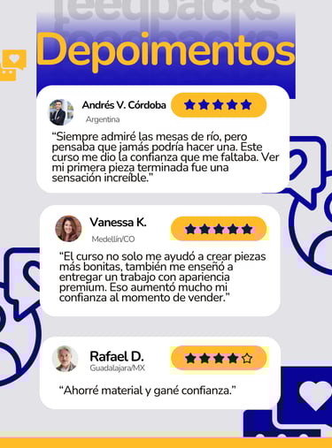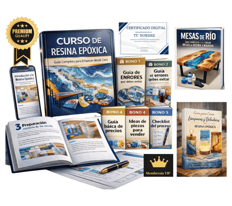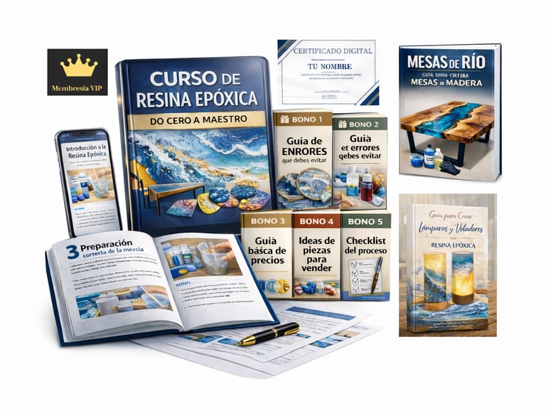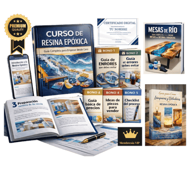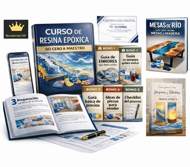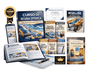 Recibirás el curso completo de Resina Epóxica desde CERO a MAESTRO, junto con 7 bonos especiales que te ayudarán a elegir materiales, evitar errores, encontrar ideas de piezas para vender, calcular precios y seguir el proceso con más seguridad, todo en formato digital para acceder desde tu celular, tablet o computador.
